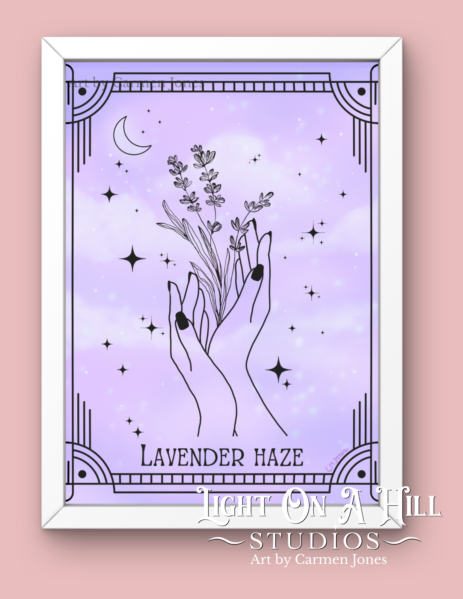 Lavender Haze is a digital art piece created by me (Carmen Jones) with line work of hands sprouting lavender in a starry lavender night sky.
