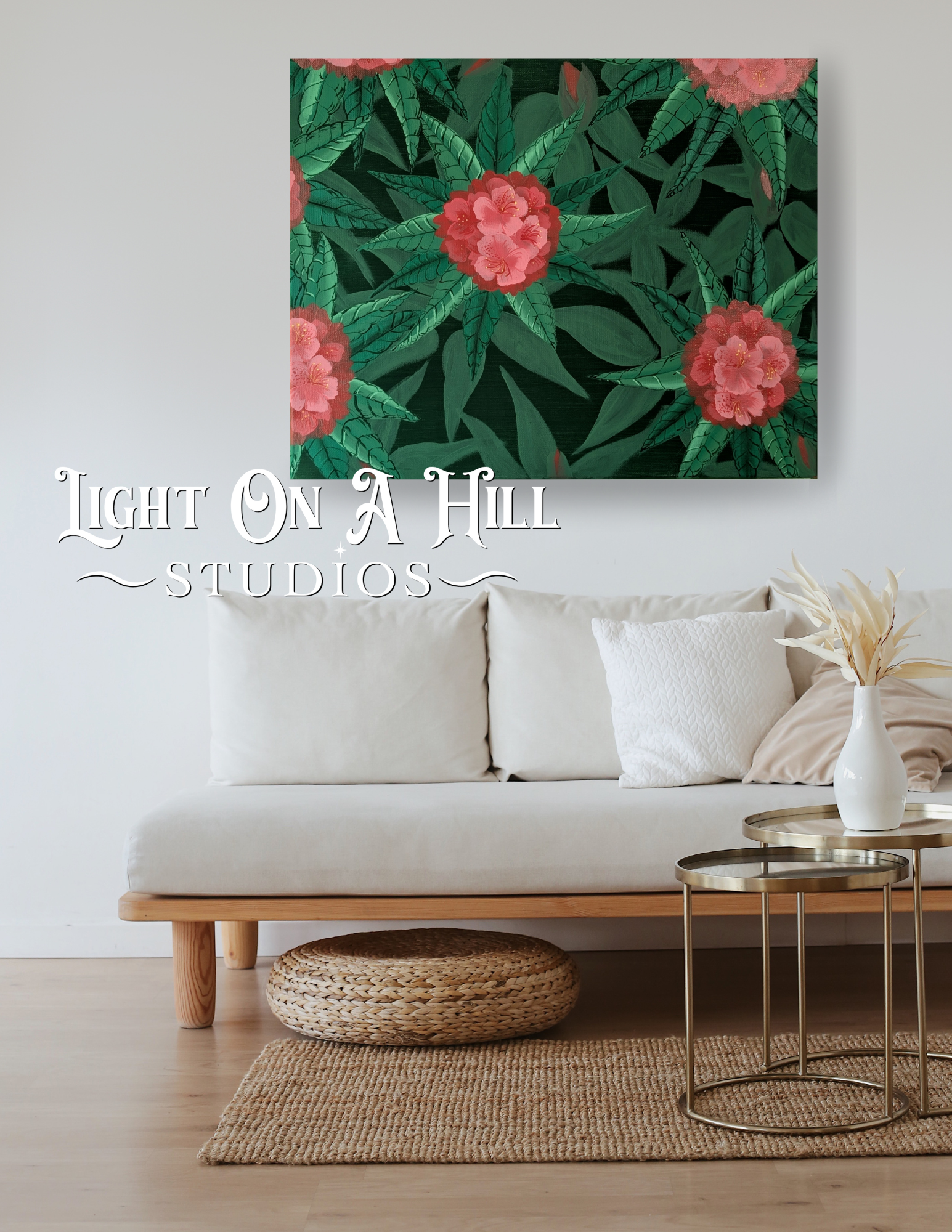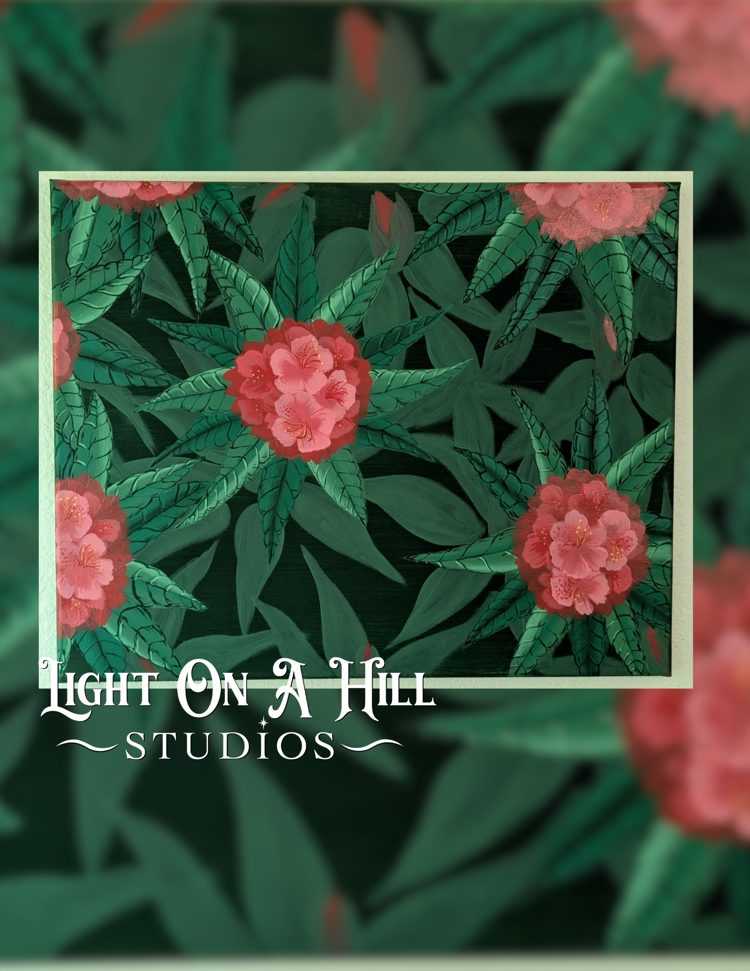 Peek of Spring is a physical art piece created by me (Carmen Jones) using acrylic paints on a stretched canvas. This piece shows layers of the bright spring rhododendron blooms.