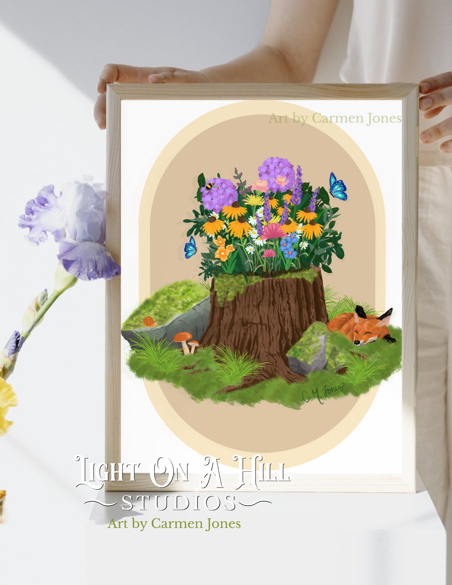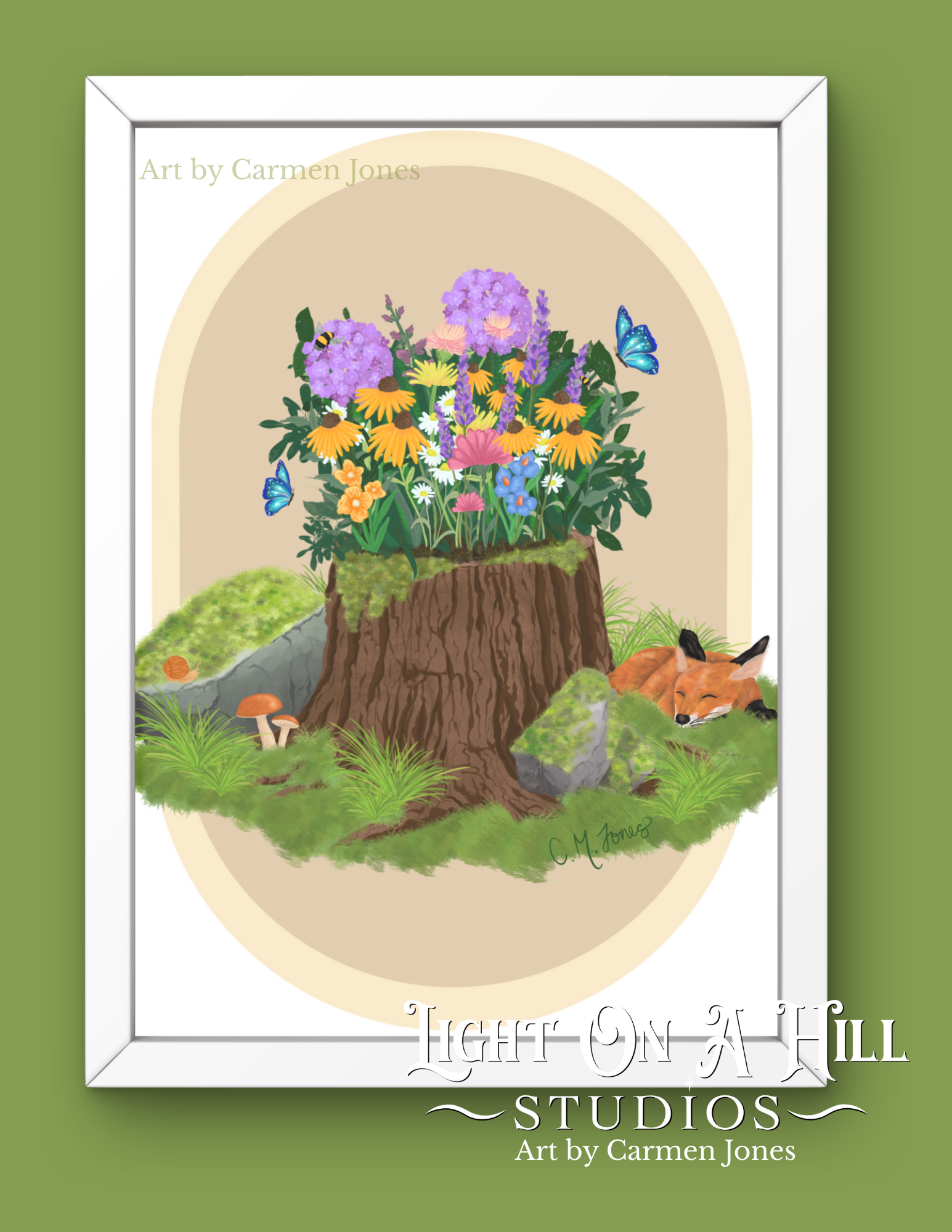 Resilient is a digital art piece created by me (Carmen Jones) showing a tree stump with blossoming flowers and greenery growing out of it. My adaptation of new life growing out of the old.